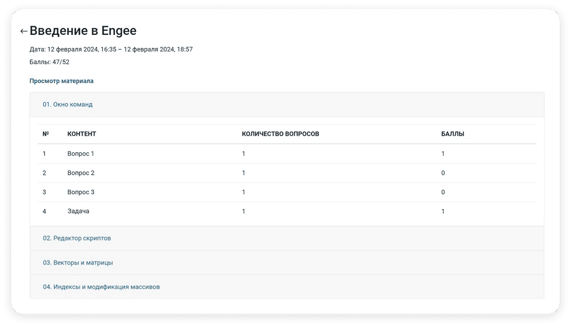 В личном кабинете Этюд можно посмотреть набранные баллы по каждому разделу курса Engee, а также перечень всех пройденных курсов Engee.