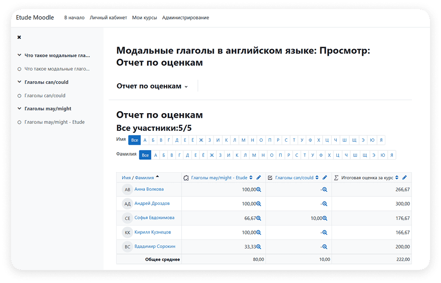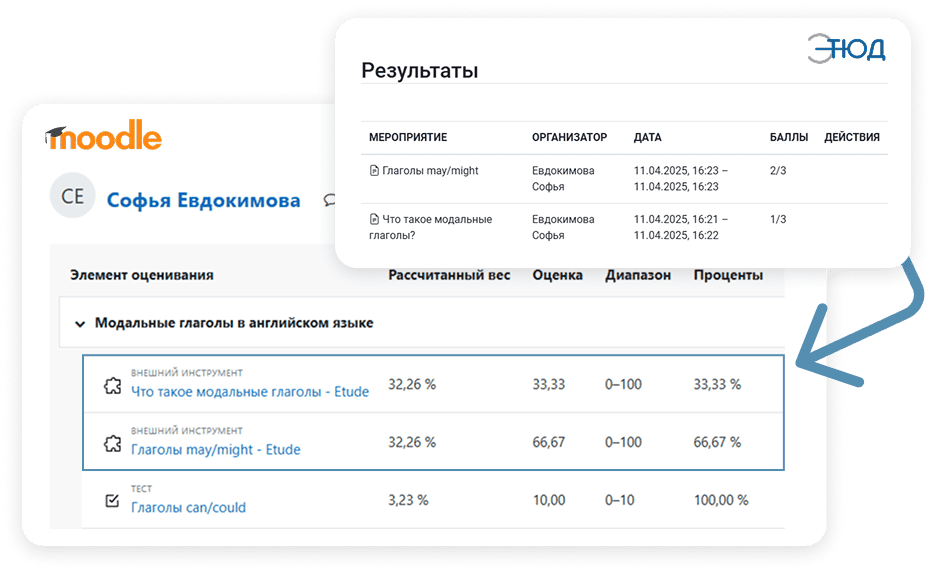 Этюд автоматически передает результаты проверки задач в LMS. Поэтому в одном курсе вы можете легко сочетать задачи Этюд с другими типами заданий.