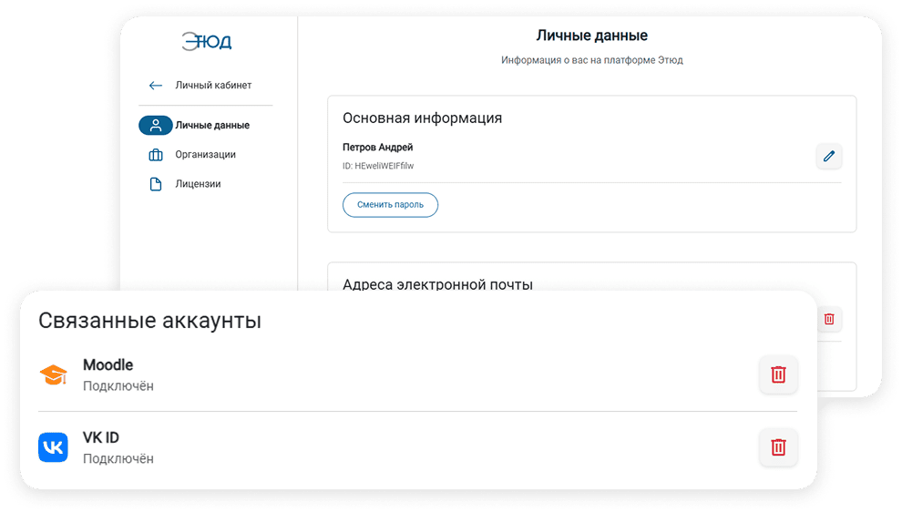 При запуске задания Этюд из LMS учётная запись пользователя автоматически синхронизируется с его учётной записью в Этюд. Управлять синхронизацией можно из профиля Этюд